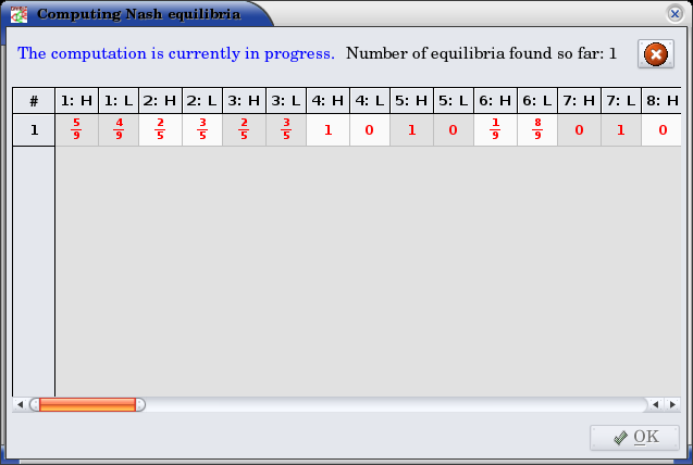 For even moderate sized games, computation of equilibrium can be a time-intensive process. Gambit runs all computations in the background, and displays a dialog showing all equilibria computed so far. The computation can be cancelled at any time by clicking on the cancel icon , which terminates the computation but keeps any equilibria computed.